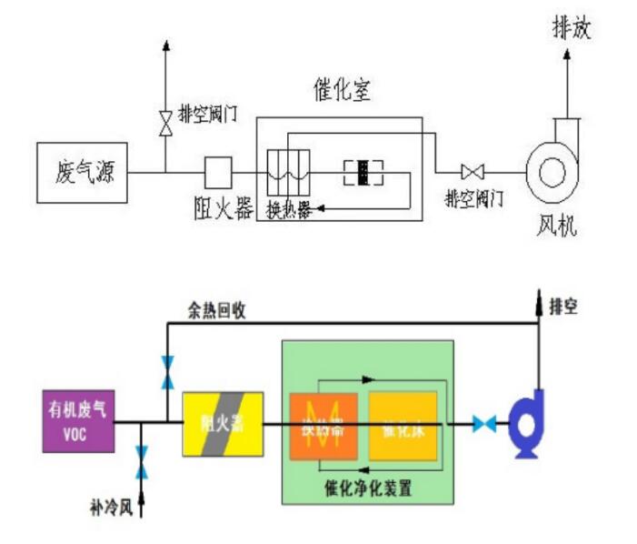 1.工藝原理 催化氧化技術(shù)(Catalytic Oxidizer,簡稱CO),通常是指將廢氣加熱到280℃以上,在催化劑的作用下將廢氣分解成CO2和和H2O,催化產(chǎn)生的高溫?zé)崃勘话迨綋Q熱器進(jìn)行循環(huán)熱交換,從而節(jié)省運行能